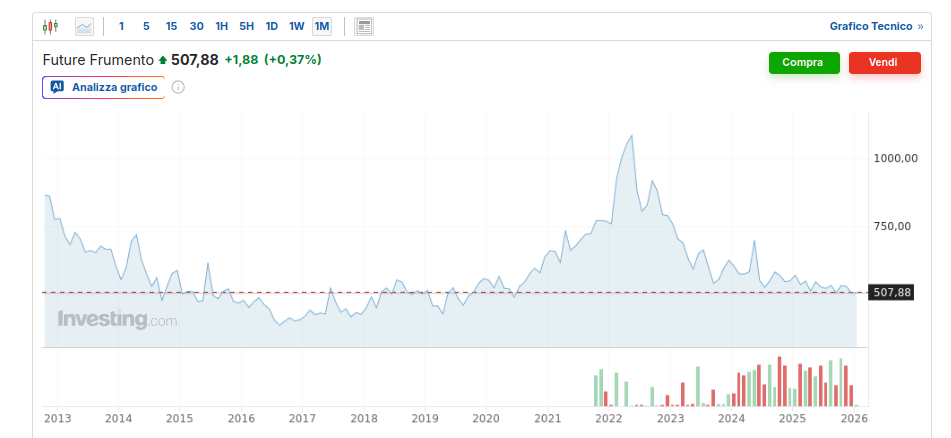 Andamento del prezzo al mercato di Chicago con i visibili picchi del 2022, vedi il prezzo live